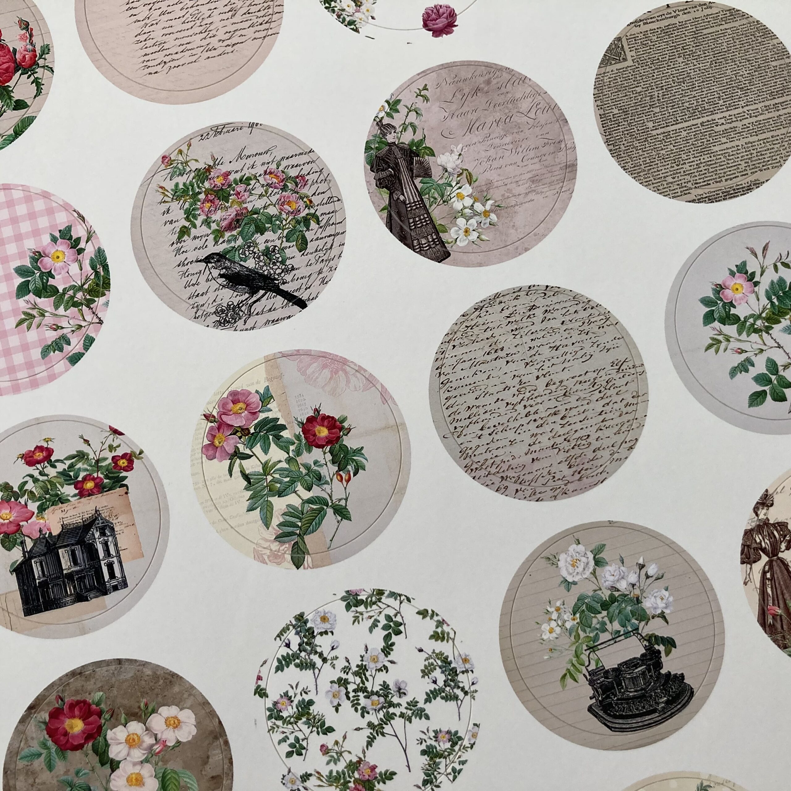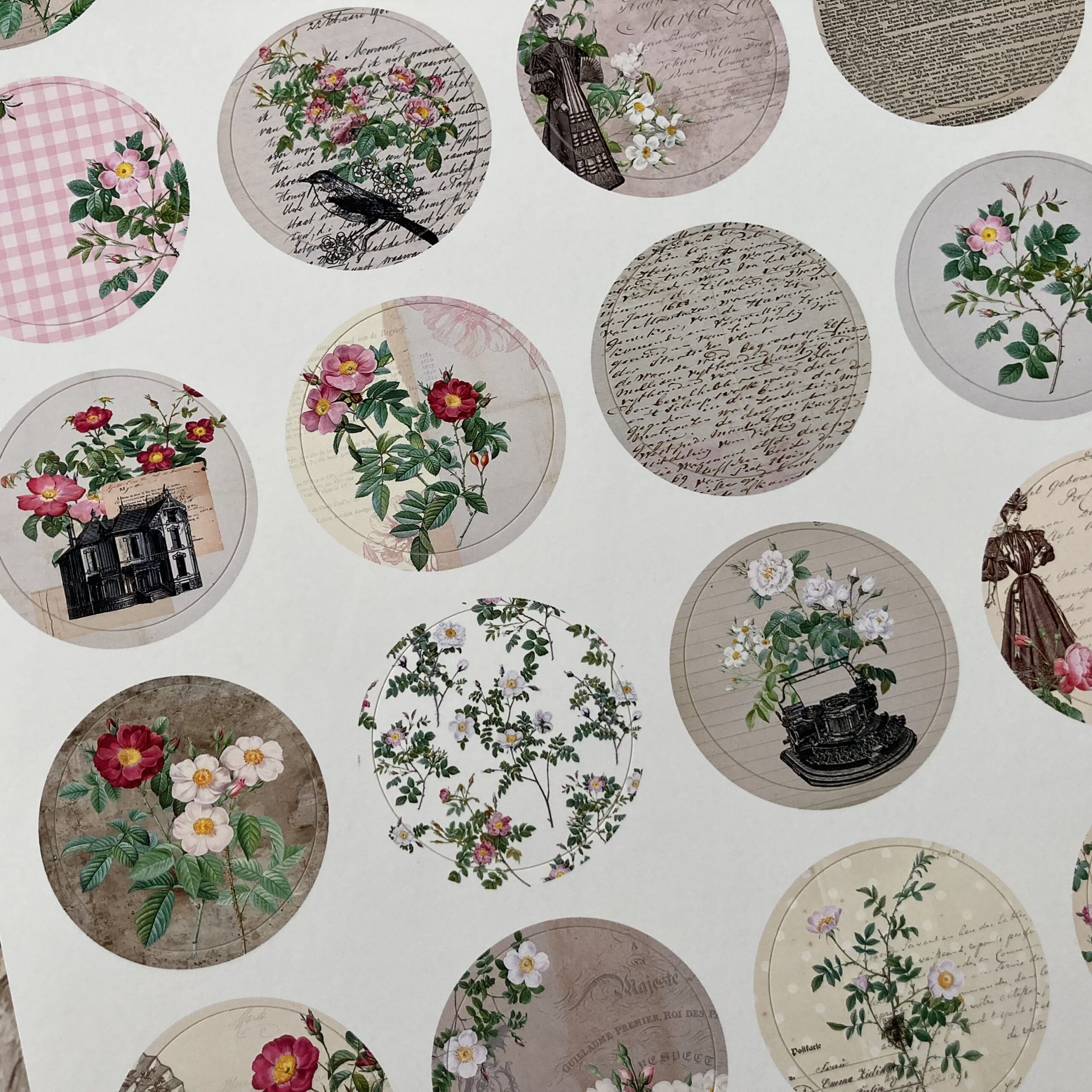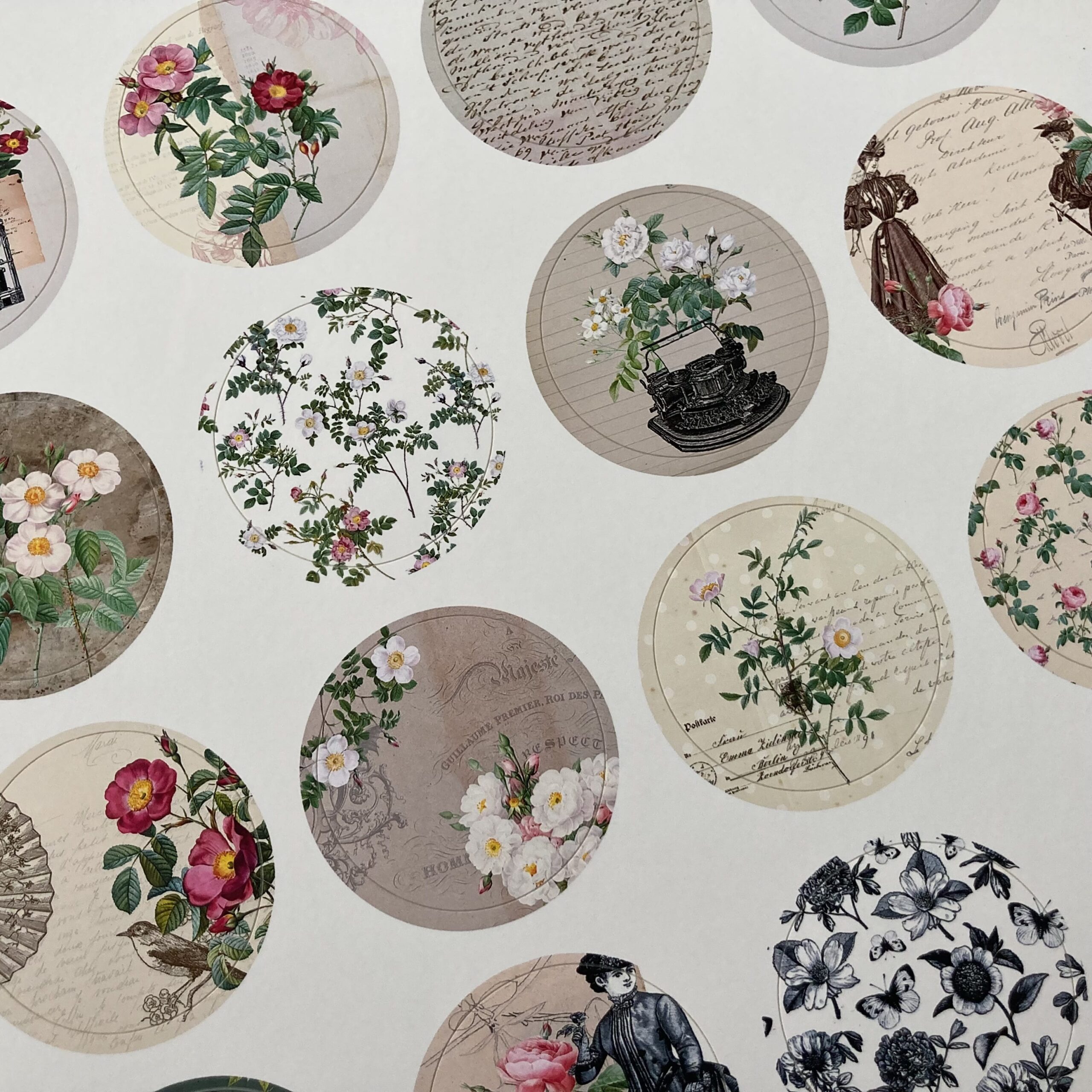 Poslední dobou jsem si hodně oblíbila vintage styl, takže se ode mě takových samolepek dočkáte ještě dost. Předsekaná kolečka o průměru 4 cm. Stačí vyloupnout! Kolečka jsou vhodná do diářů, na journaling a spoustu dalších kreativních papírových hrátek.