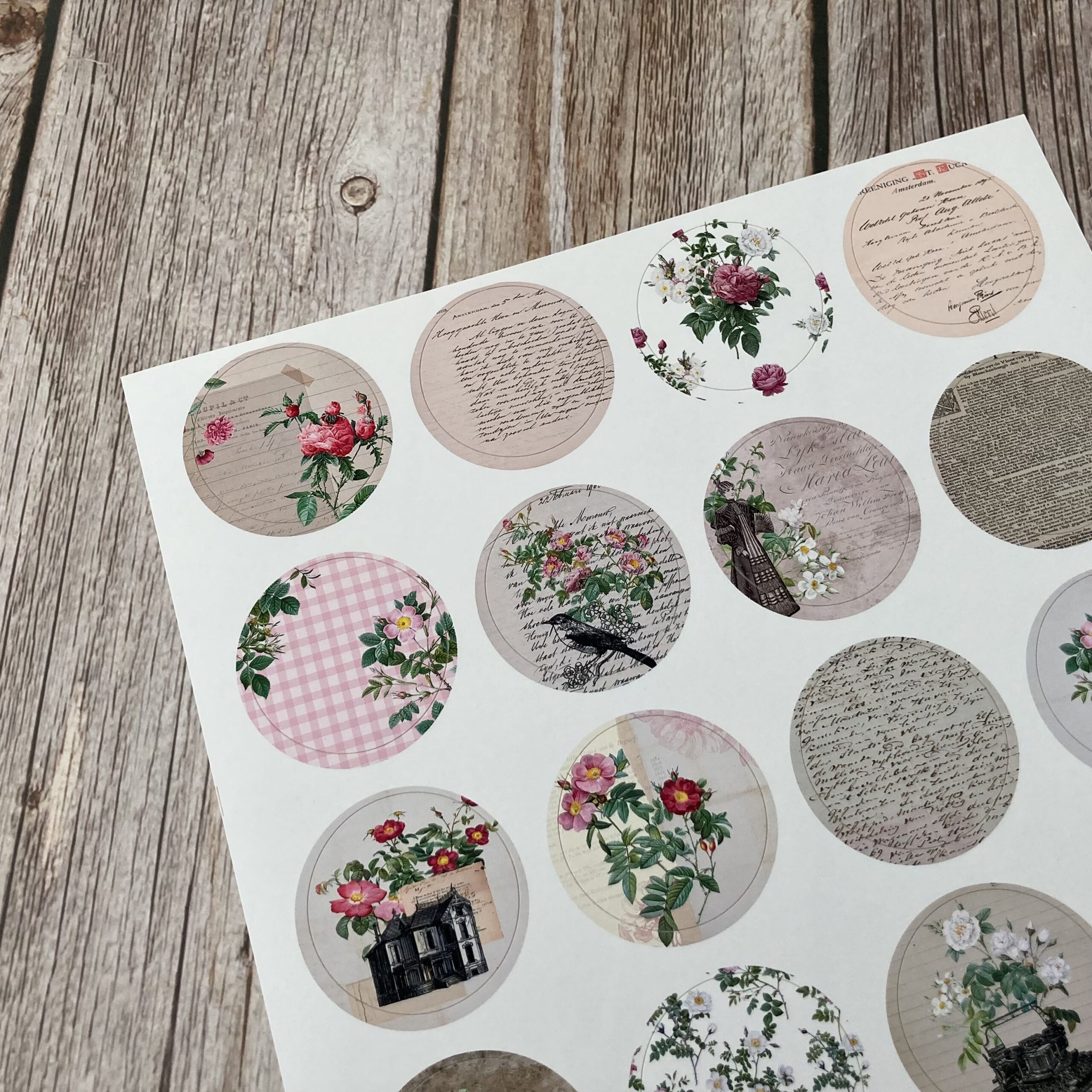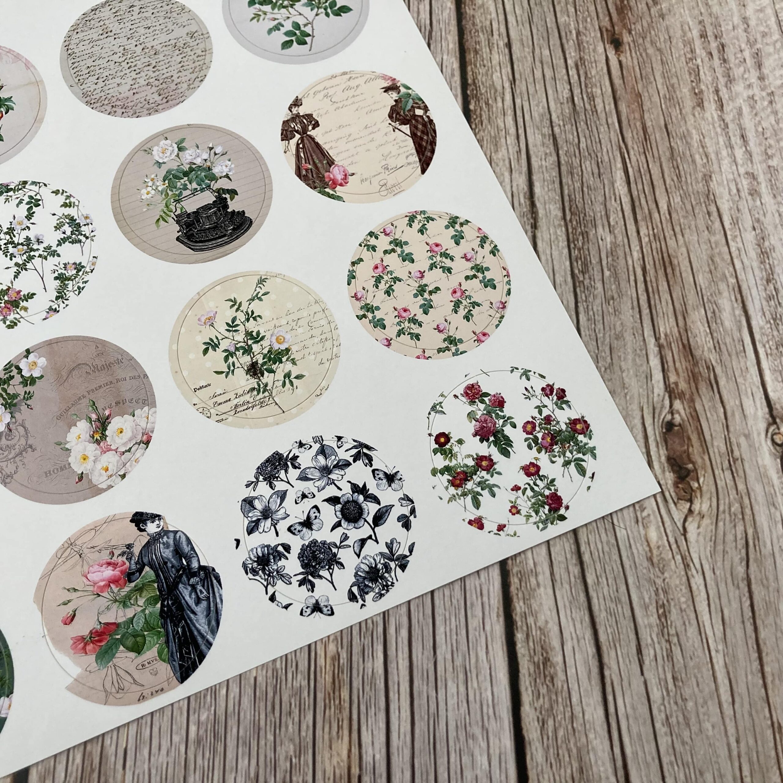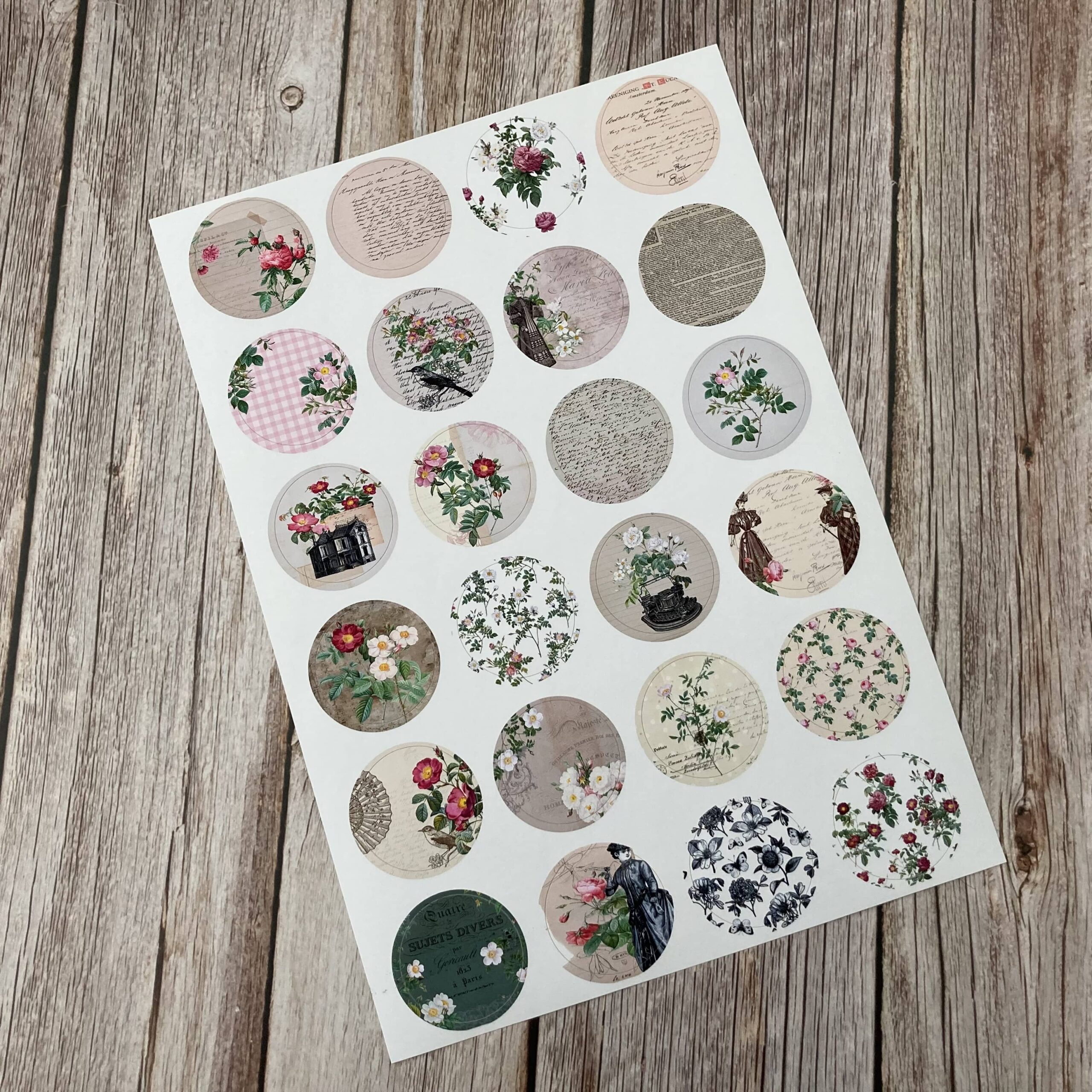 Poslední dobou jsem si hodně oblíbila vintage styl, takže se ode mě takových samolepek dočkáte ještě dost. Předsekaná kolečka o průměru 4 cm. Stačí vyloupnout! Kolečka jsou vhodná do diářů, na journaling a spoustu dalších kreativních papírových hrátek.